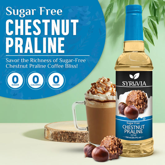 Syruvia’s sugar free chestnut praline coffee syrup combines roasted chestnut richness with buttery praline sweetness — without sugar.