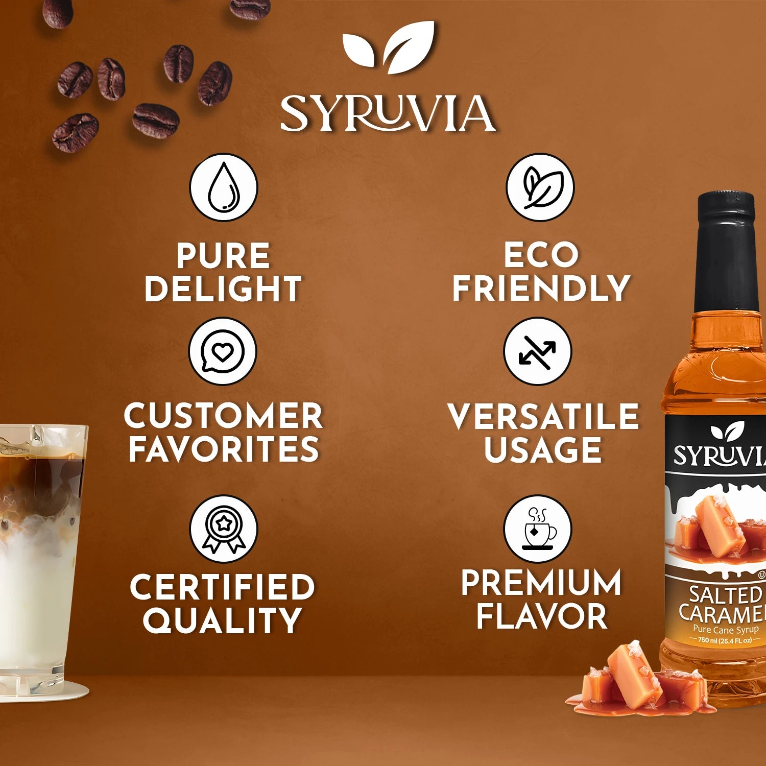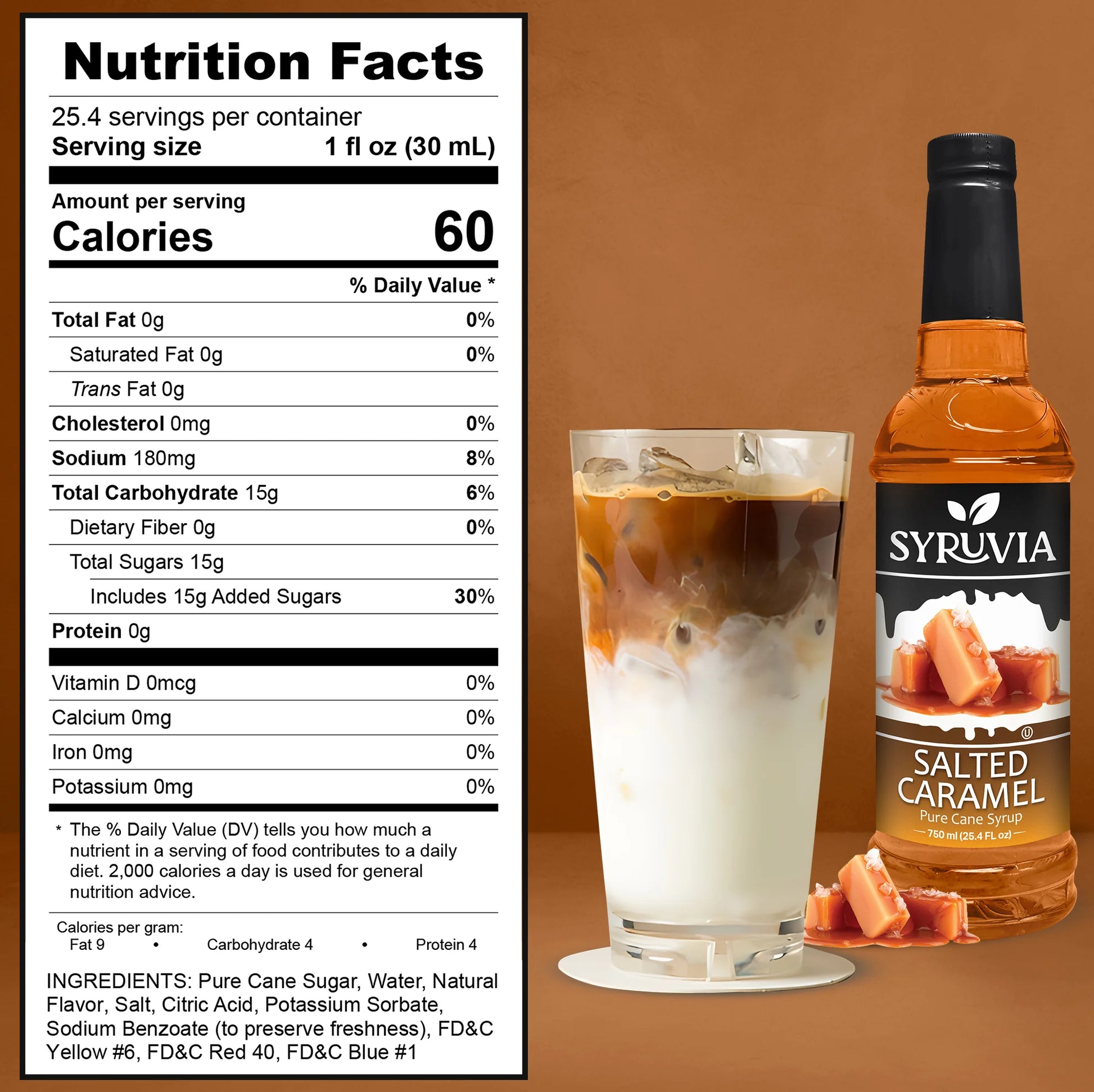 - Pure Cane Sugar: Syruvia Salted Caramel Syrup is sweetened with pure cane sugar, providing a natural and balanced sweetness.