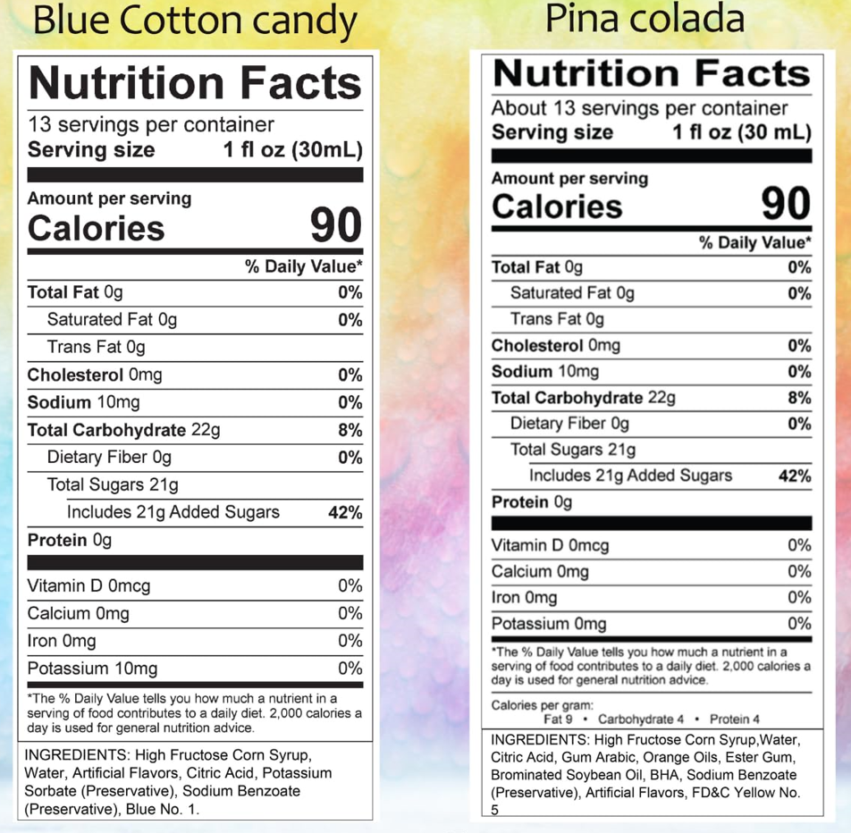 BLUE COTTON CANDY: HIGH FRUCTOSE CORN SYRUP, WATER, ARTIFICIAL FLAVORS, CITRIC ACID, POTASSIUM SORBATE (PRESERVATIVE), SODIUM BENZOATE (PRESERVATIVE), BLUE NO. 1.