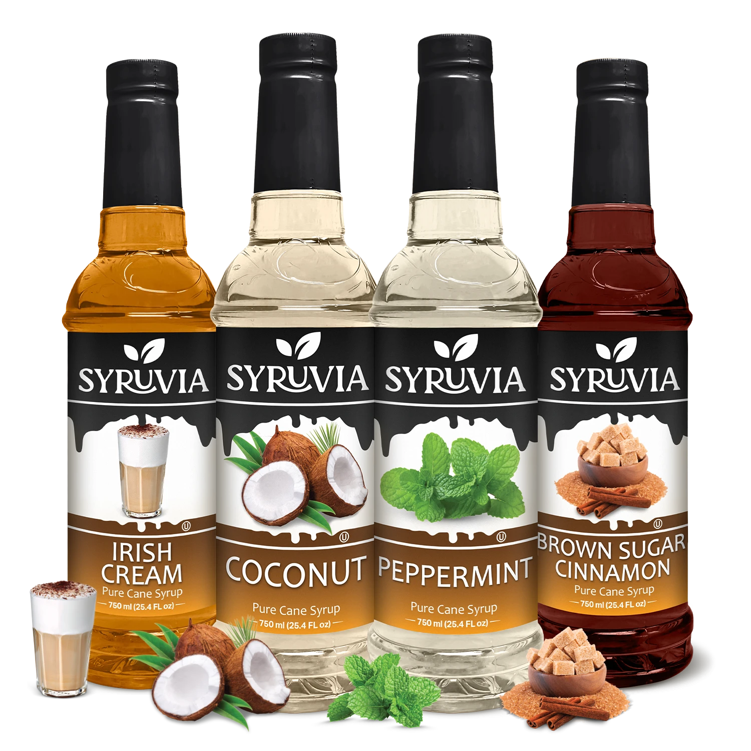 • Immerse yourself in sophistication with our Syruvia Coffee Syrup Elegant Ensemble. With luxurious Irish Cream, aromatic Brown Sugar Cinnamon, tropical Coconut, and refreshing Peppermint flavors, each 25.4 fl oz bottle is a symphony of sophisticated taste!