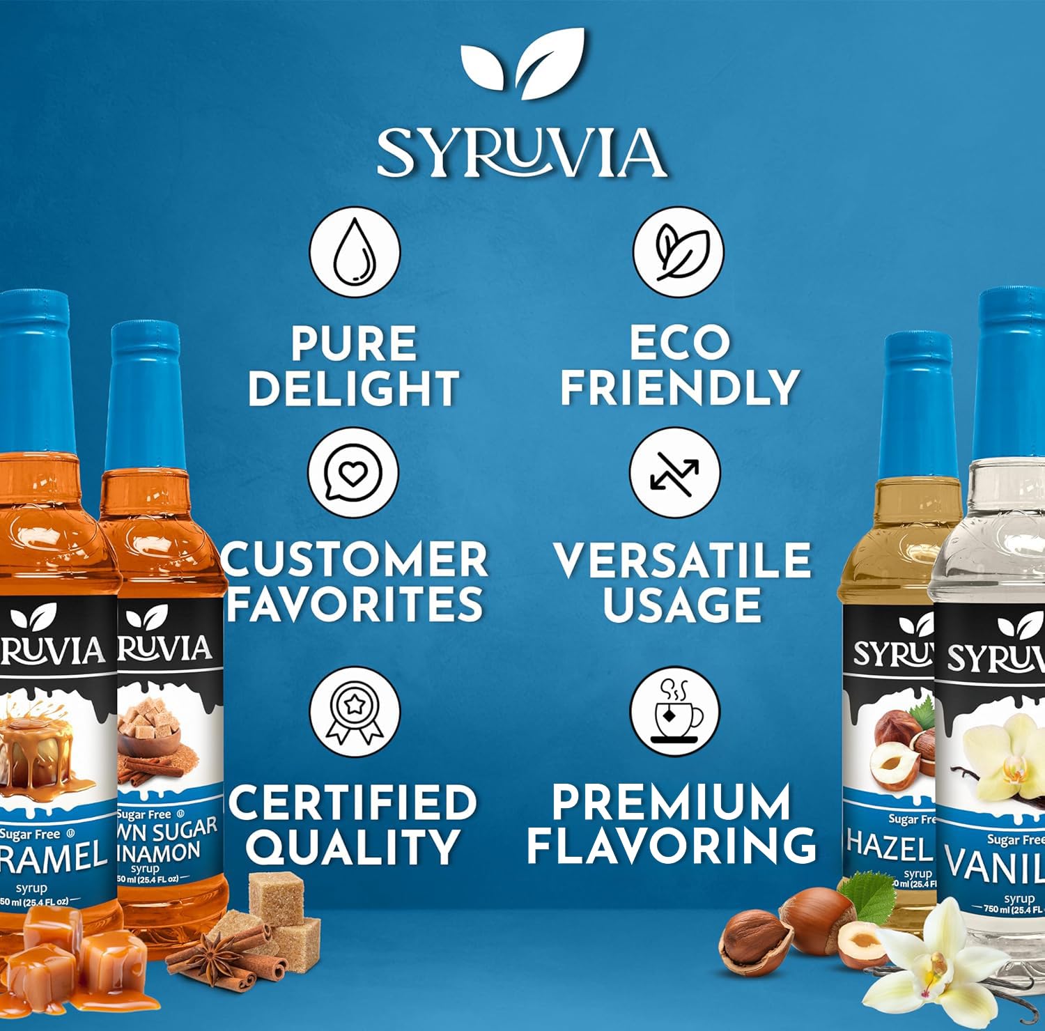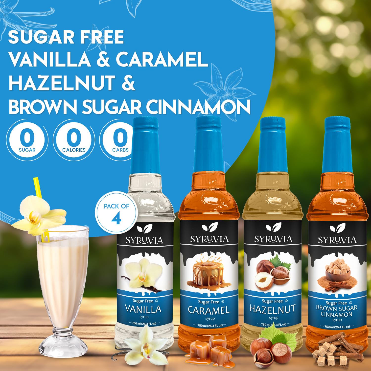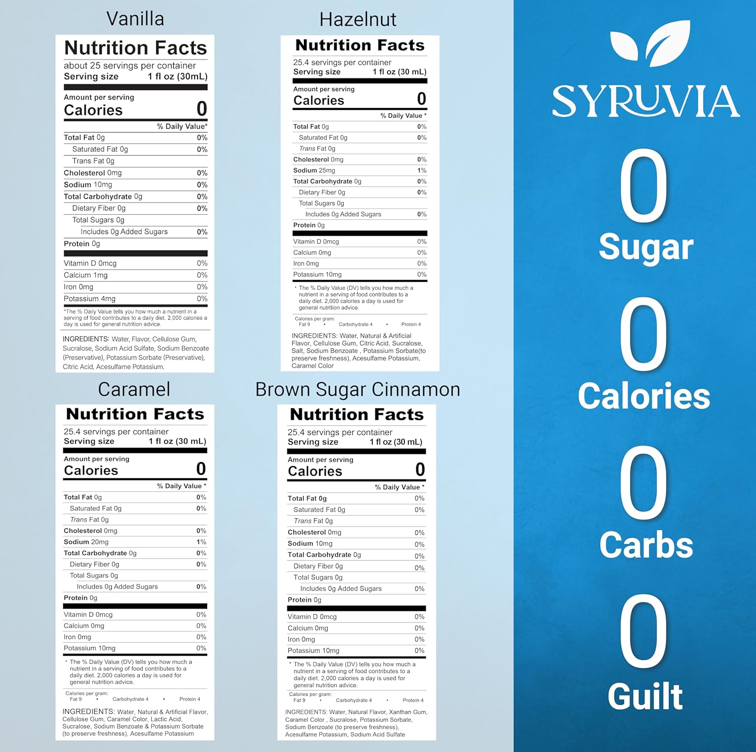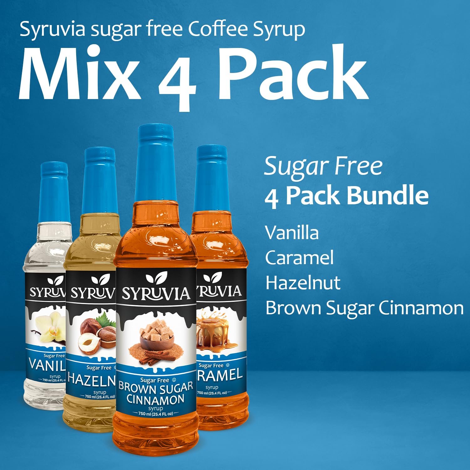 - Embrace guilt-free indulgence with our Syruvia Sugar-Free Coffee Syrup Harmony Pack. Featuring the classic flavors of Vanilla, Caramel, Hazelnut, and Brown Sugar Cinnamon, each 25.4 fl oz bottle is sugar-free, allowing you to enjoy your favorite coffee creations without compromise!