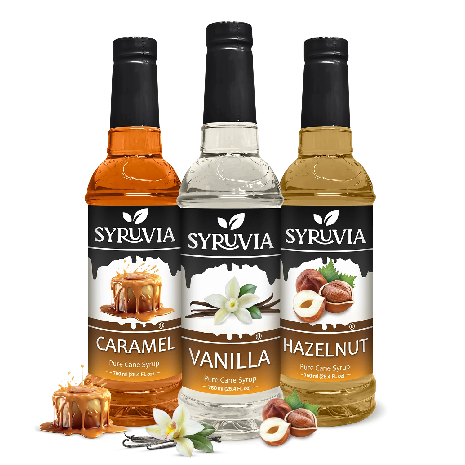 - Transport yourself to a decadent paradise with our exquisite trio of syrups – one capturing the smooth, classic essence of vanilla, another boasting the rich, buttery sweetness of caramel, and the third embracing the nutty allure of hazelnuts. Elevate your taste experience with this perfect trifecta, where comforting flavors converge for a blissful escape in every sip and drizzle.