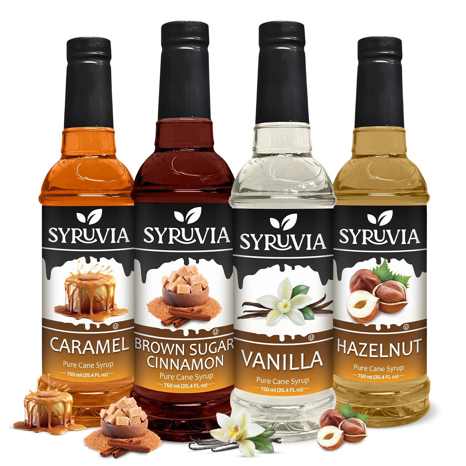• Indulge in the perfect blend of sweetness and warmth with our Syruvia Coffee Syrup Flavor Fusion Pack. Featuring rich Vanilla, luscious Caramel, nutty Hazelnut, and aromatic Brown Sugar Cinnamon flavors, each 25.4 fl oz bottle transforms your coffee into a heavenly treat!