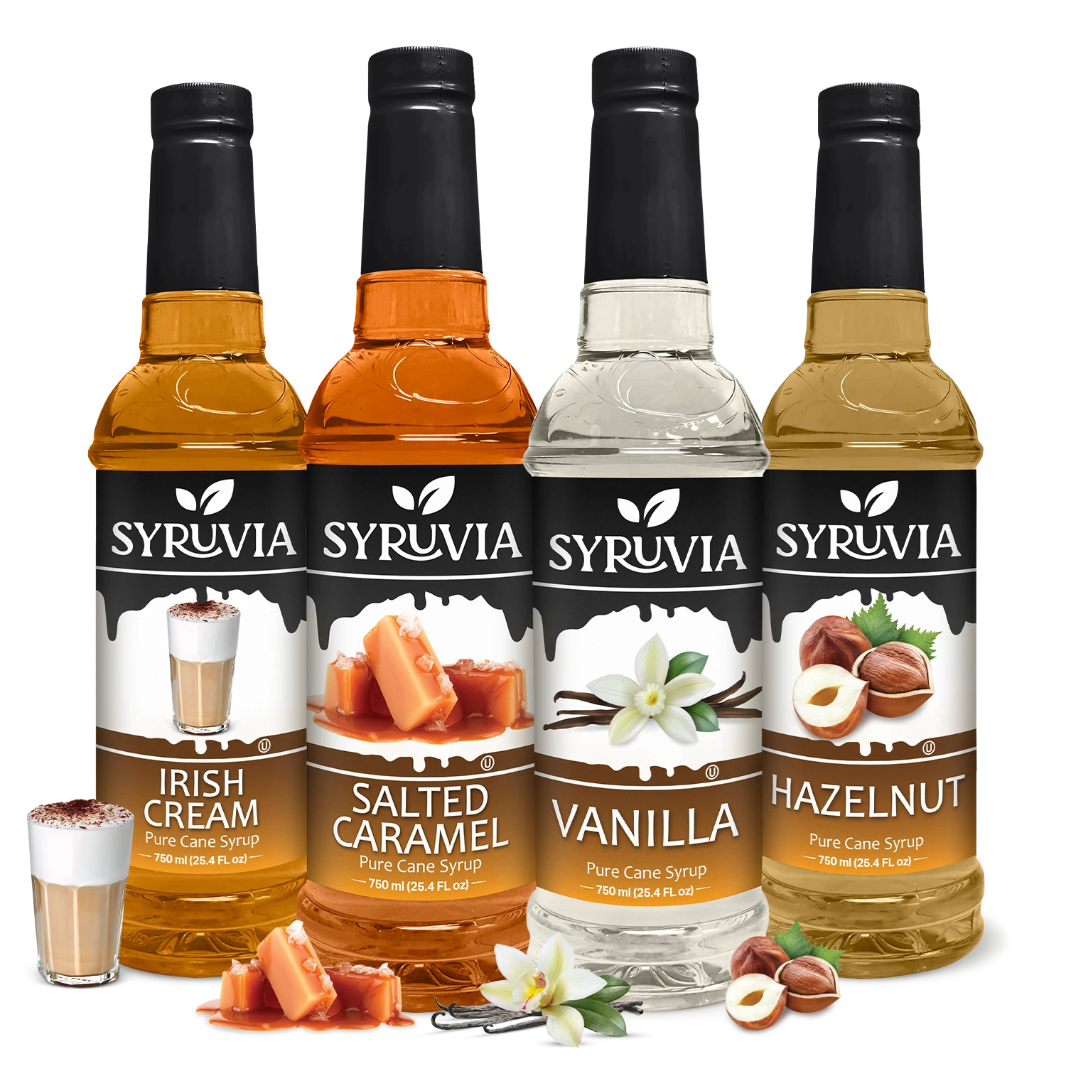 - Transform your coffee routine with our Syruvia Coffee Syrup Variety Pack, boasting delightful flavors of Vanilla, Salted Caramel, Hazelnut, and Irish Cream. Each 25.4 fl oz bottle is crafted to perfection, ensuring a gluten-free and kosher indulgence that enhances every sip.