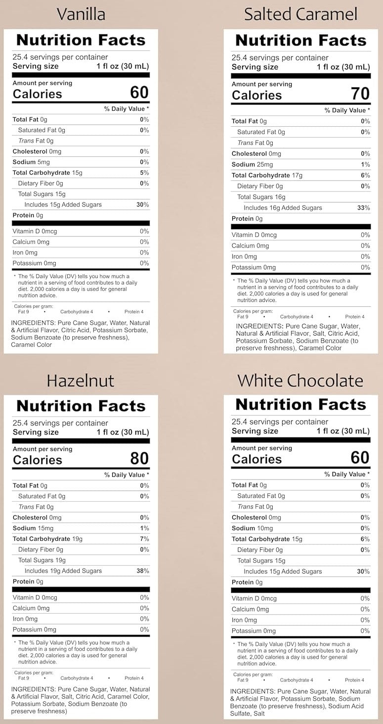 Variety Pack, Vanilla, Salted Caramel, Hazelnut, and White Chocolate Syrup